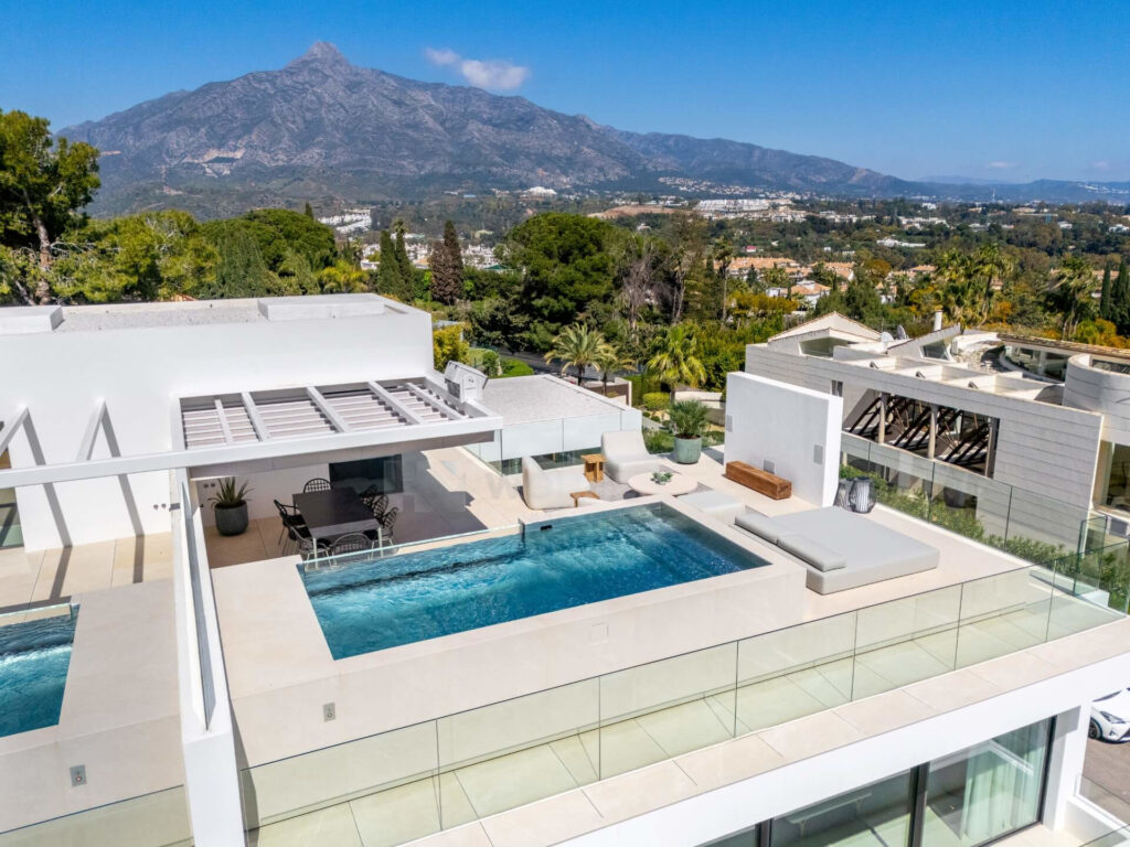 One of the property’s most outstanding features is the impressive rooftop solarium, complete with a swimming pool, outdoor kitchen, and a fully equipped open-air cinema with an integrated projector. From this level, you can enjoy sweeping views of the Mediterranean Sea, the iconic La Concha mountain, and the surrounding landscape, making it an unbeatable setting for sunset gatherings and movie nights under the stars.