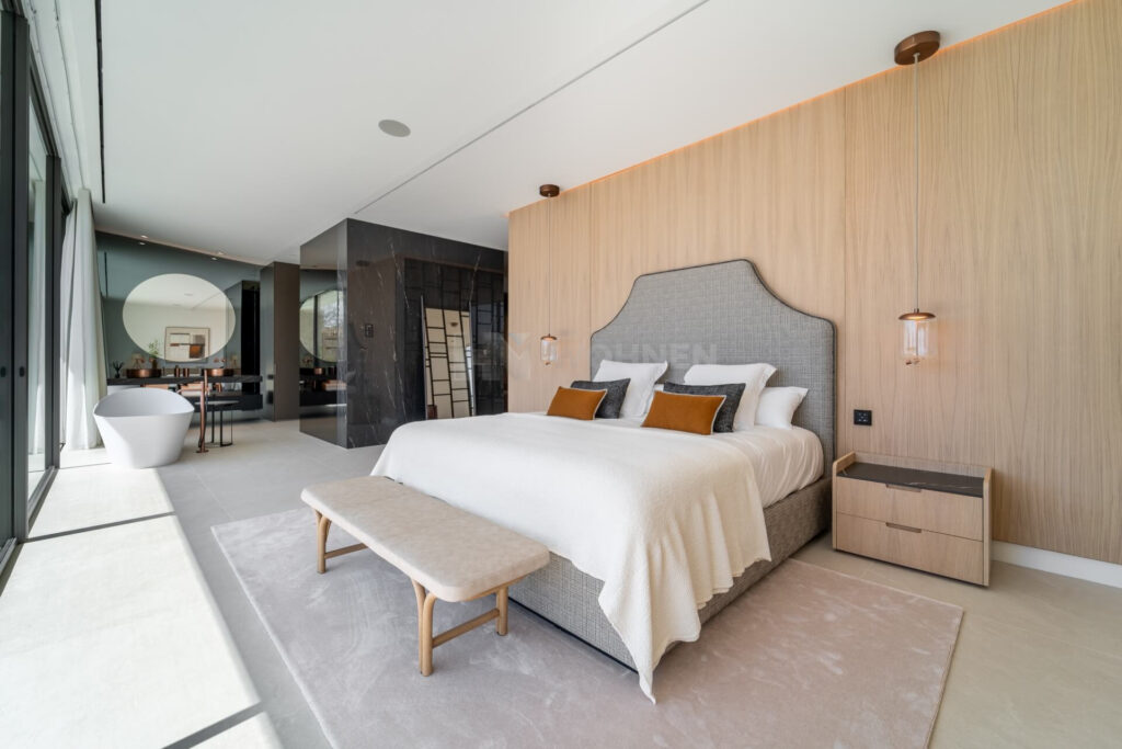 On the first floor, there are three bedrooms, each with an en-suite bathroom. The rooms feature oak floors, abundant natural light, and Porcelanosa marble finishes, offering an atmosphere of sophistication and comfort. The master bedroom is particularly noteworthy for its size, spacious walk-in closet, full en-suite bathroom, and windows that offer open and pleasant views.