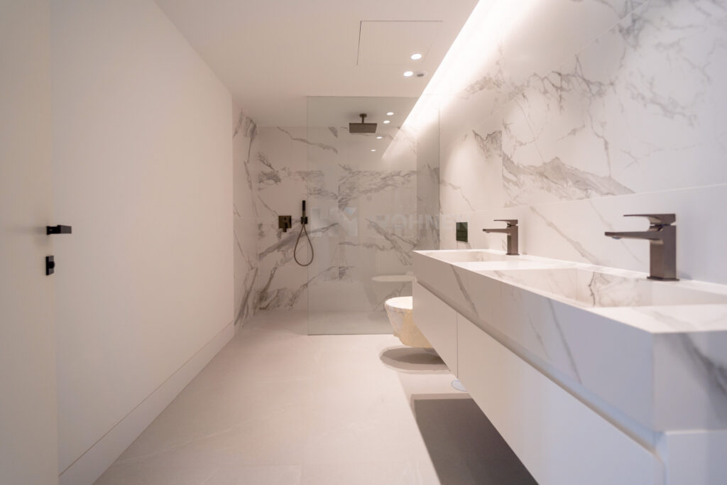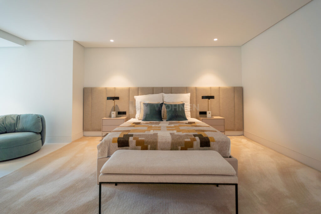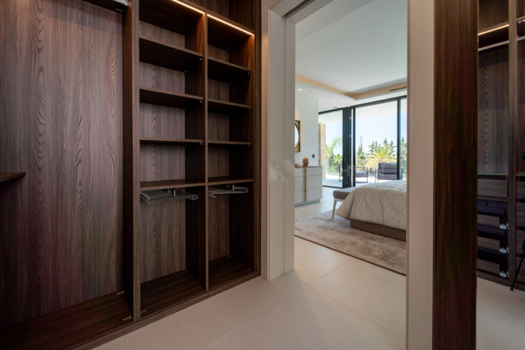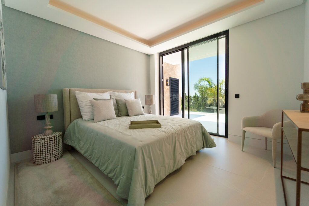 The villa includes five bedrooms, each with its own en-suite bathroom. The primary suite occupies the upper level, offering a private terrace, walk-in closet, and open views of the surroundings. The remaining bedrooms are designed for privacy and comfort, maintaining a consistent sense of proportion and calm throughout.